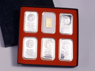 Own or give the gift of these certified bright and shiny one gram .9999 fine gold bar and five 1 OZ. .999 silver bars minted in the USA by well-known Sunshine Minting. All bars are freshly made and individually packed in their air-tite, crystal clear, non-yellowing and scratch resistant acrylic holders. They are securely placed in a velvet lined laminated box.This is a nice lot of gold and silver bullion in a beautiful gift box and is guaranteed to delight everyone.